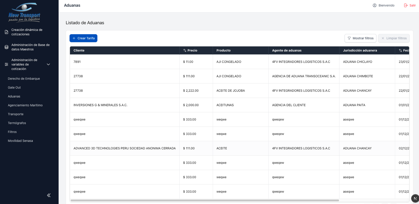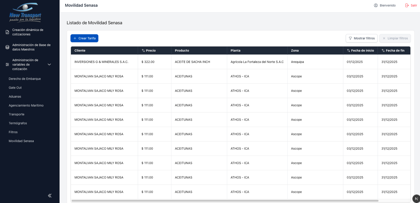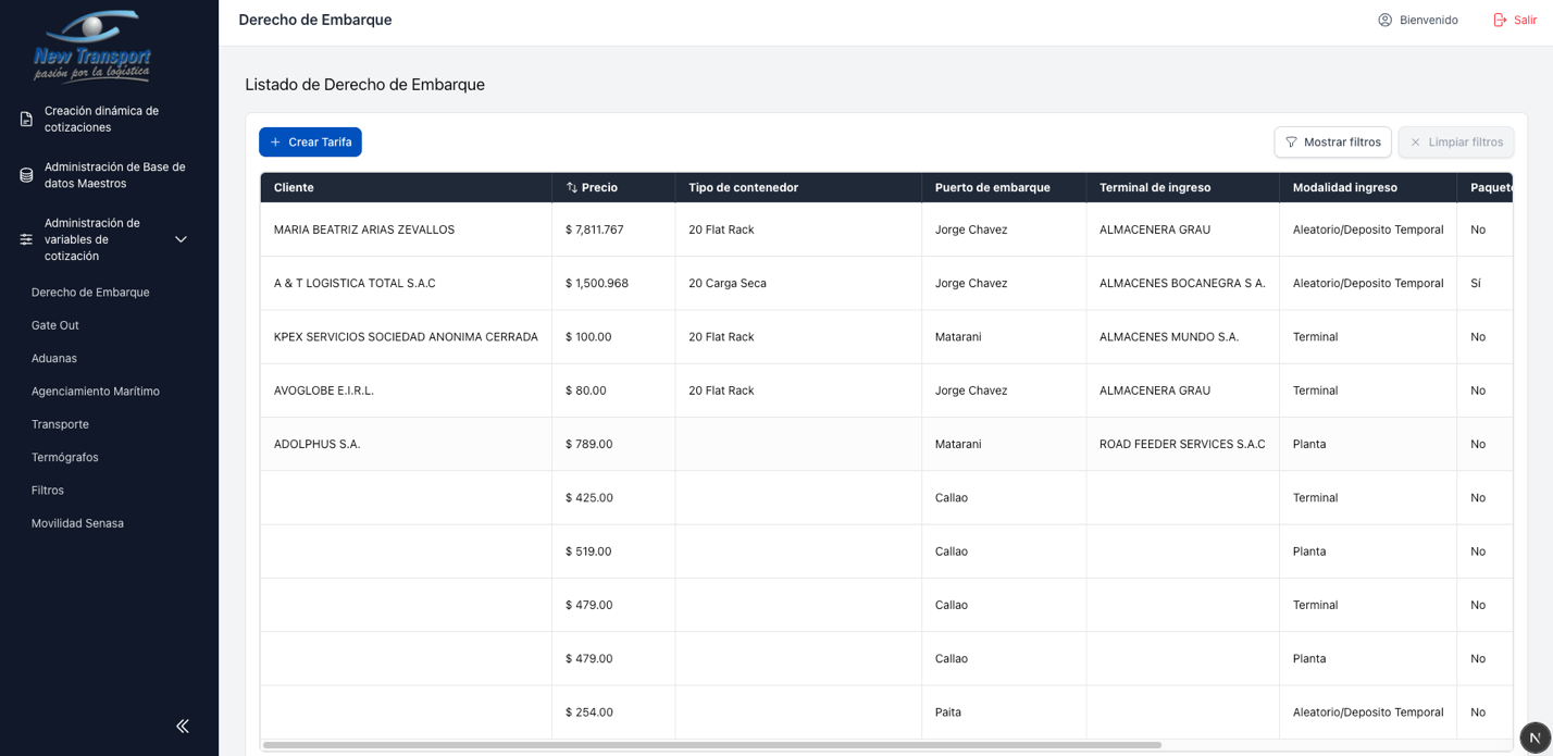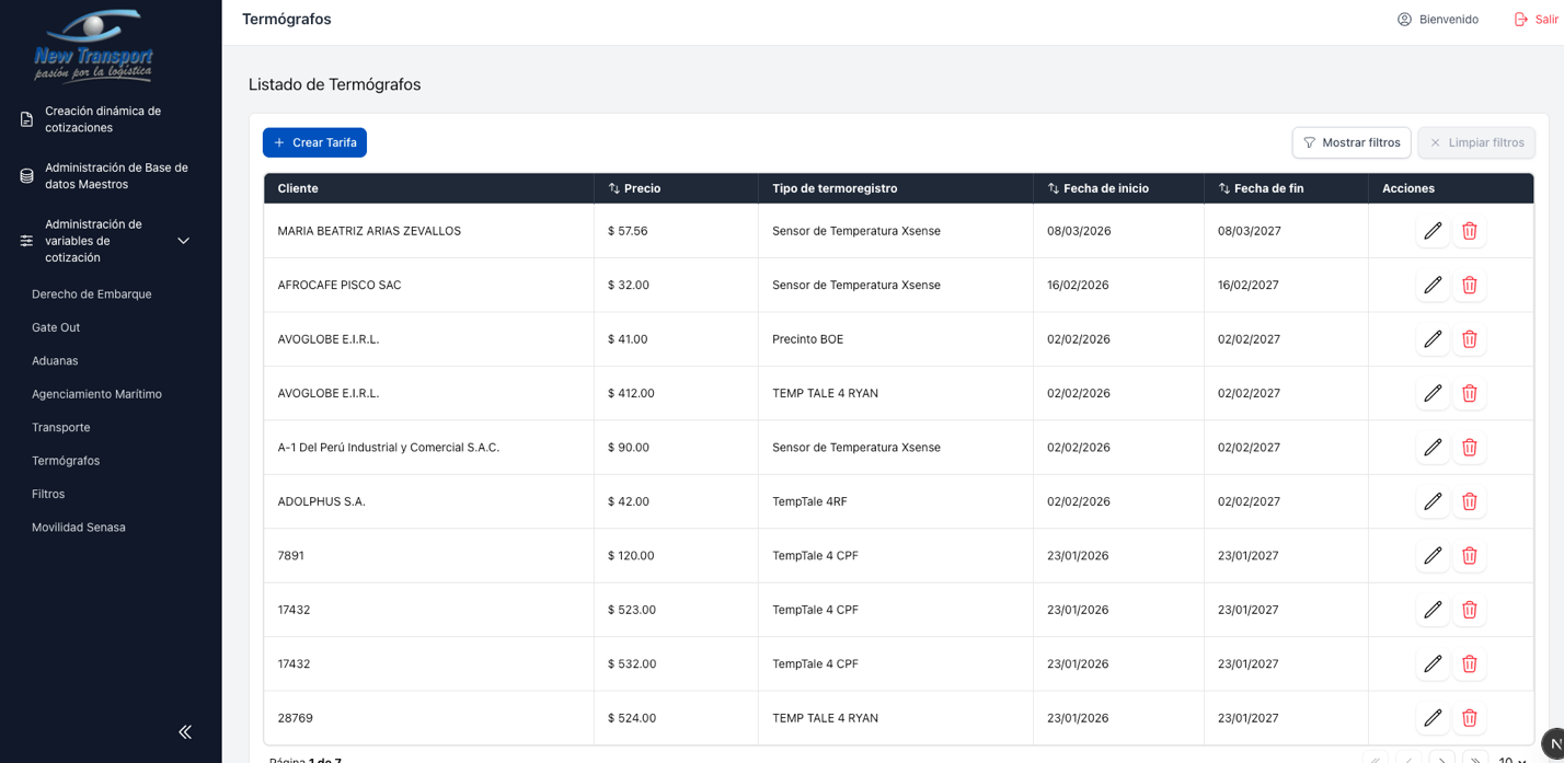 Este modulo agrupa la administracion de tarifas utilizadas en el proceso de cotizacion. Cada tipo de servicio tiene su propia seccion, pero todas comparten el mismo comportamiento de listado y mantenimiento.