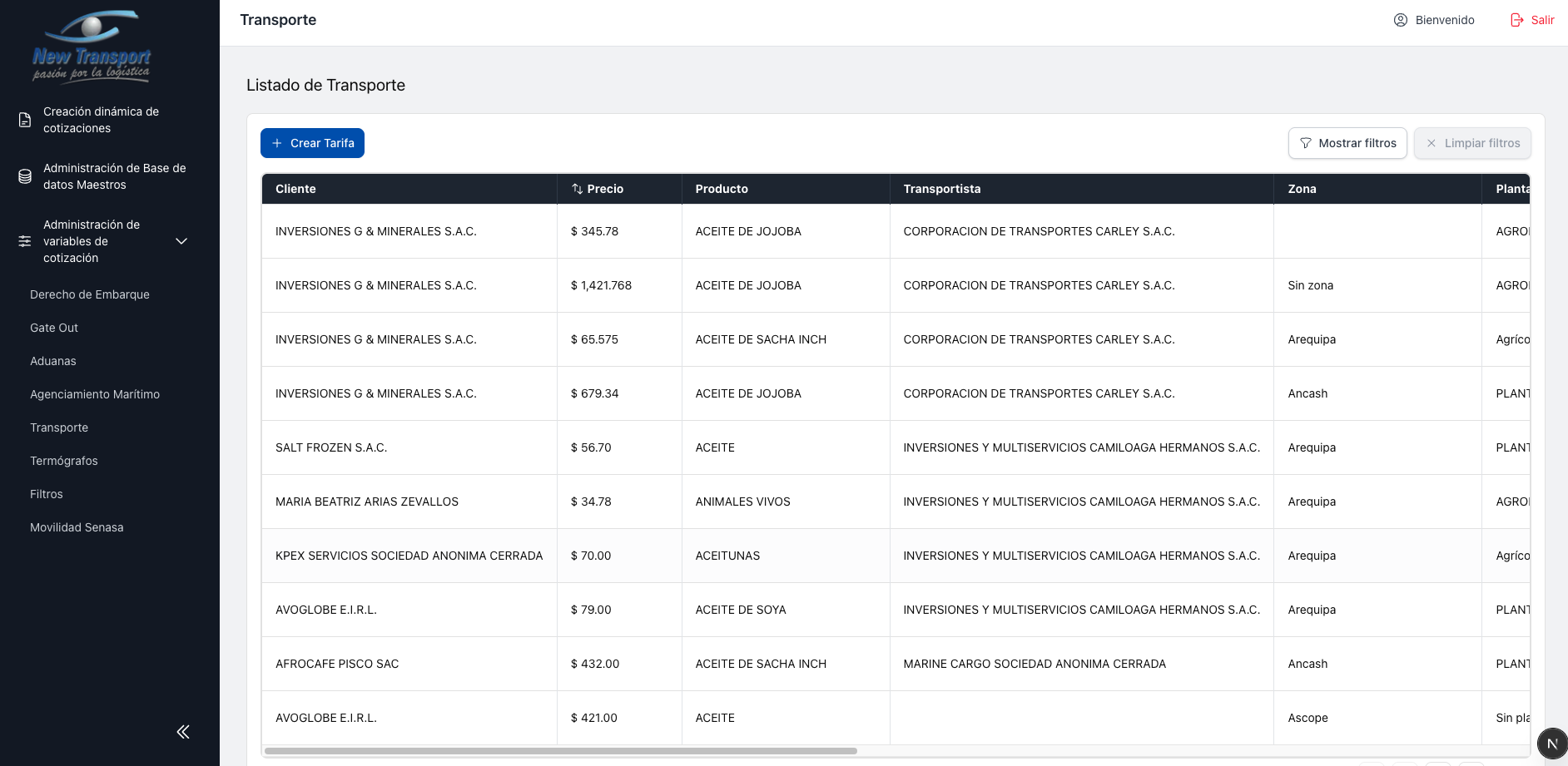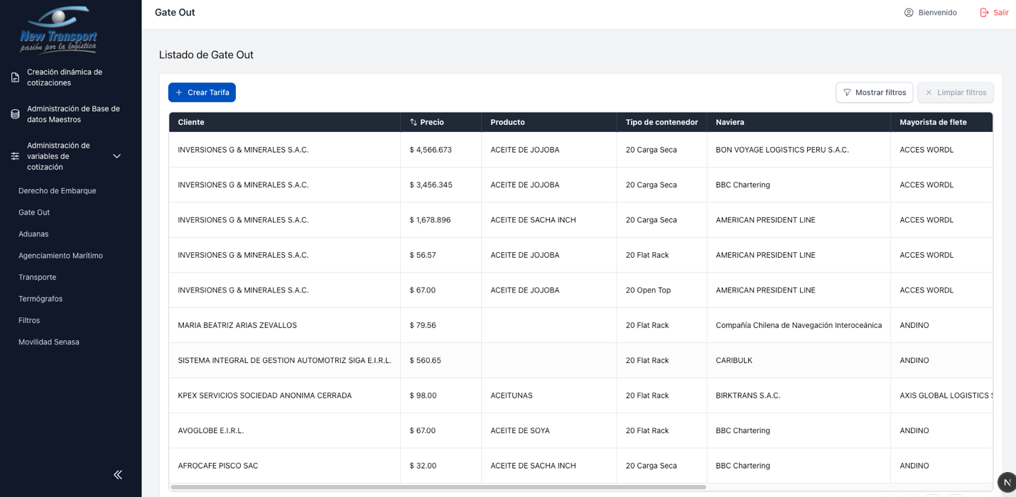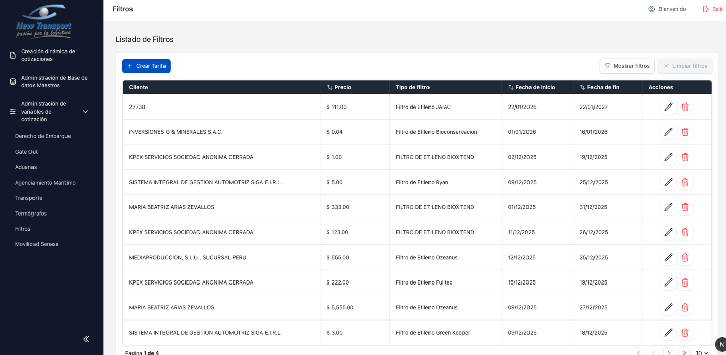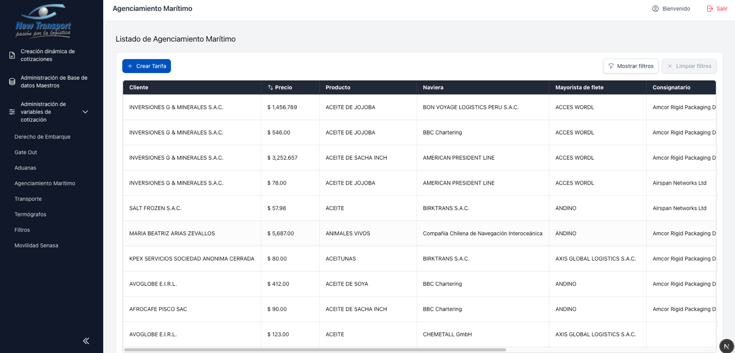 Este modulo agrupa la administracion de tarifas utilizadas en el proceso de cotizacion. Cada tipo de servicio tiene su propia seccion, pero todas comparten el mismo comportamiento de listado y mantenimiento.
